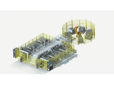 ● 下料堆垛:采用ABB或庫卡六軸機(jī)器人,對(duì)不同檔位的電池托盤進(jìn)行堆垛到棧板上,后續(xù)由人工叉車或者AGV小車出料;