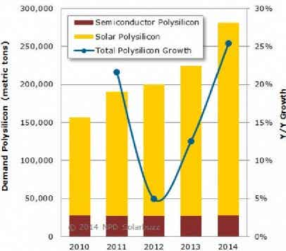 鋰電世界 根據最新NPD Solarbuzz多晶硅和硅片供應鏈季度報告Polysilicon and Wafer Supply Chain Quarterly顯示,2014年太陽能和半導體級多晶硅需求預計將大幅上漲至282,000噸,比去年增加25%。多晶硅需求大幅上漲的主要原因是終端市場光伏組件出貨量的增加,2014年太陽能光伏組件出貨量預計將達到近49GW。