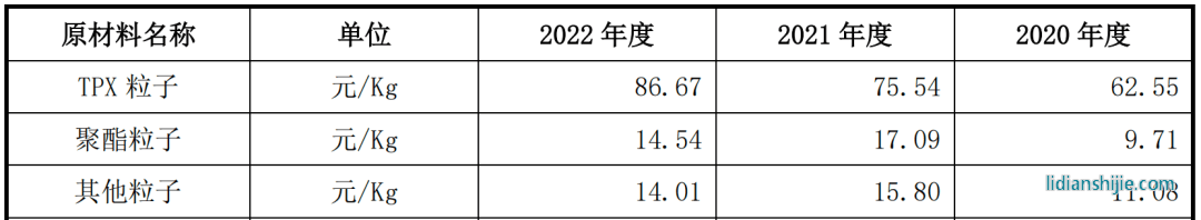 新廣益生產(chǎn)所需的原材料主要為粒子、基材以及其它輔助材料等,2022年粒子的采購金額占到采購總額的53.99%,較2020年上漲了14個百分點。其中TPX粒子采購金額增長明顯,一方面是因為新廣益加大了囤貨,另一方面TPX粒子的采購單價明顯上漲,從2020年的62.55元/Kg增長至2022年的86.67元/Kg。