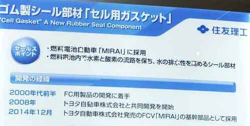 住友理工在“人與車科技展2015”(5月20~22日于太平洋橫濱國際會(huì)展中心舉行)上,首次展出了向豐田燃料電池車(FCV)“MIRAI”首次展出了向豐田燃料電池車的燃料電池用橡膠制粘合材料“電池單元用密封墊片”。