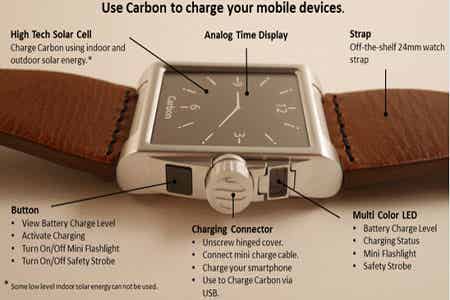 Carbon是一款與眾不同的智能手表,與其他產(chǎn)品不同的是,它還可以為你的智能手機(jī)充電。它內(nèi)置了一個(gè)太陽(yáng)能充電板和800毫安時(shí)的電池,可以在室外及擁有自然光照的室內(nèi)吸收太陽(yáng)能。當(dāng)你的智能手機(jī)沒(méi)電時(shí),Carbon可以用來(lái)應(yīng)急充電,當(dāng)然不能把手機(jī)充滿。