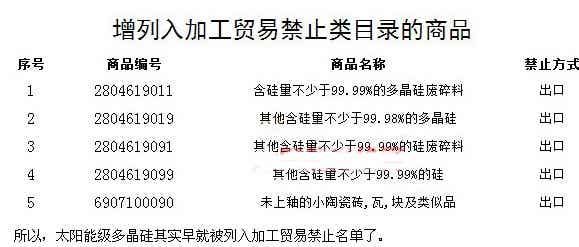 所以,太陽能級多晶硅其實早就被列入加工貿易禁止名單了。