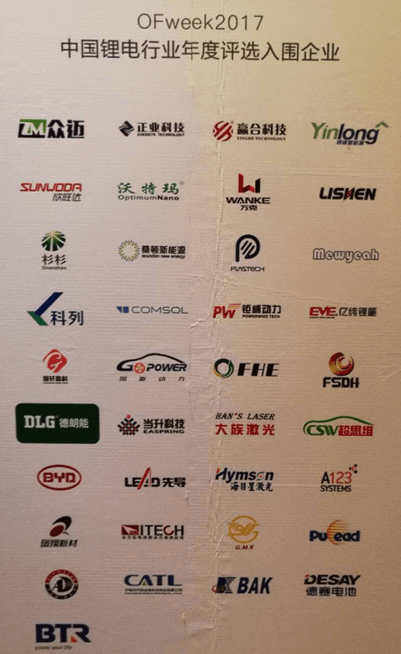 核心提示: 2017年11月13日晚,“OFweek財富之夜”歡迎晚宴2017中國高科技產業年度評選暨中國鋰電行業頒獎晚會在深圳大中華喜來登大酒店隆重舉行,四川富驊新能源科技有限公司總經理劉一町及技術總監劉興泉教授出席了此次頒獎盛典。在此次評選中,四川富驊新能源科技有限公司獲得“中國鋰電行業材料創新產品獎”這一殊榮,公司技術