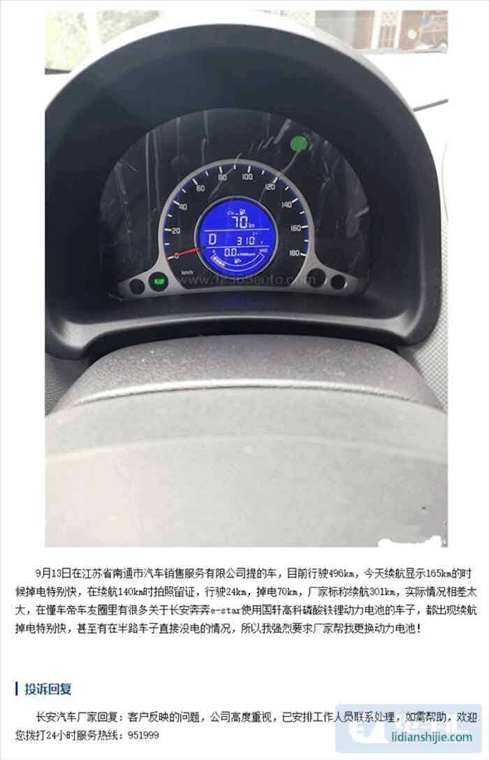 回應背后,有不少長安奔奔E-Star車主在網絡上發帖或者投訴網站投訴稱其車輛續航電量下降過快,實際續航與廠家宣傳的存在巨大差異。