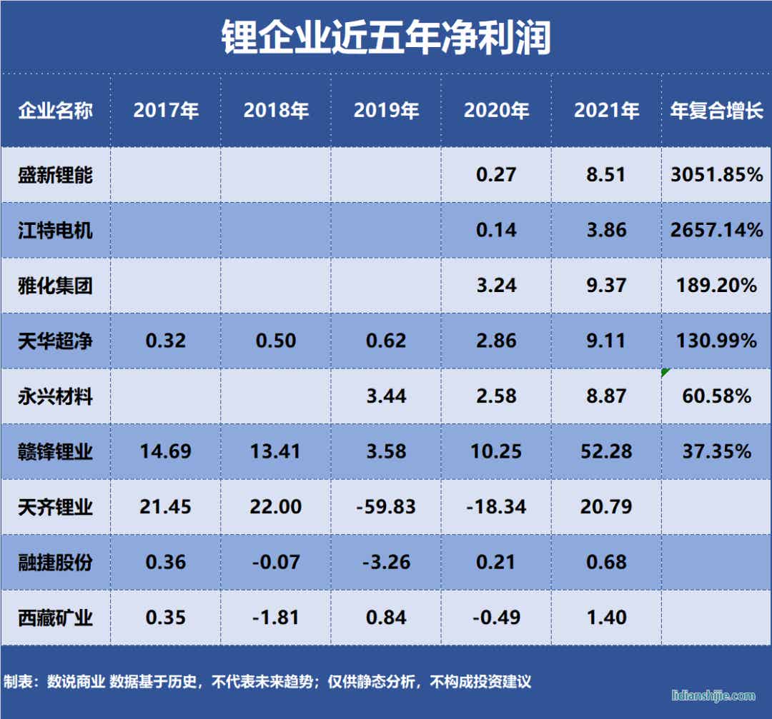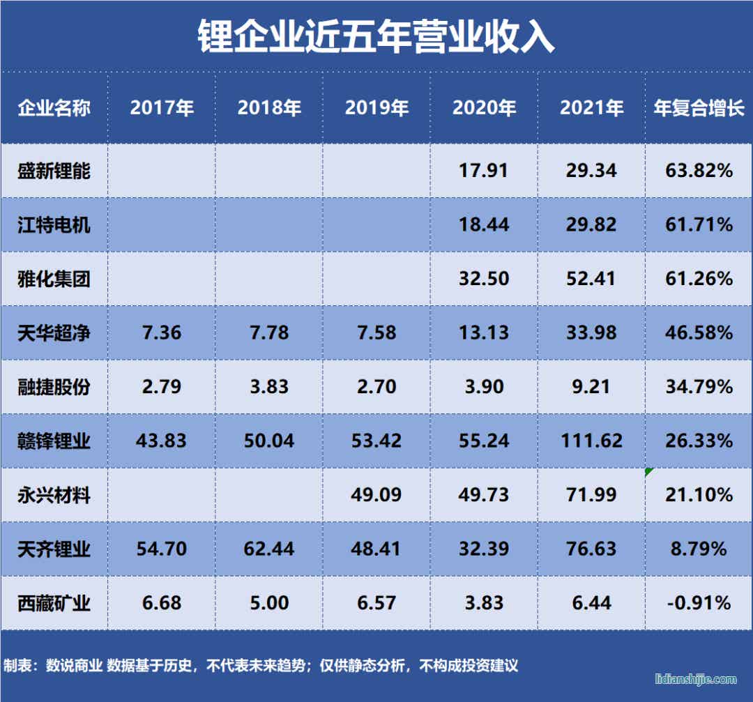 從近五年營收復(fù)合增長來看,盛新鋰能、江特電機、雅化集團等3家企業(yè)增幅超過60%,其中盛新鋰能復(fù)合增長63.82%。
