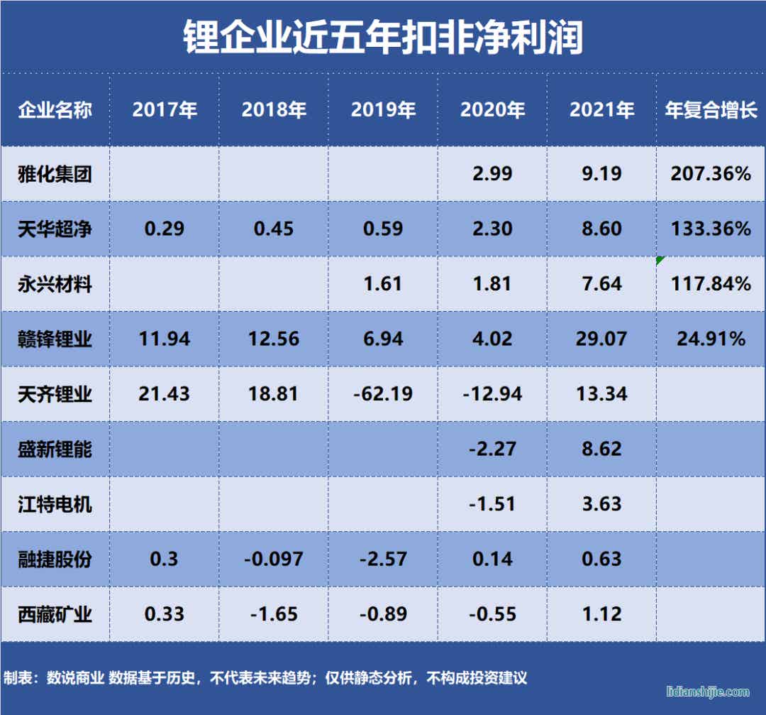 從近五年扣非凈利潤復(fù)合增長來看,雅化集團、天華超凈、永興材料等3家企業(yè)實現(xiàn)倍數(shù)增長,其中雅化集團復(fù)合增長207.36%。