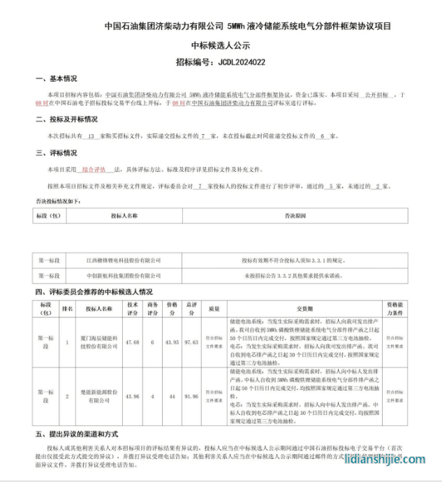 北極星儲(chǔ)能網(wǎng)獲悉,5月29日,中國(guó)石油濟(jì)柴動(dòng)力5MWh液冷儲(chǔ)能系統(tǒng)部件框采中標(biāo)候選人公示,據(jù)悉,海辰儲(chǔ)能、楚能新能源、鵬輝能源、瑞浦蘭鈞、天合儲(chǔ)能、中創(chuàng)新航和贛鋒鋰電共7家企業(yè)參與投標(biāo)。其中中創(chuàng)新航和贛鋒鋰電被否決,最終海辰儲(chǔ)能、楚能新能源分別為第一、第二中標(biāo)候選人。