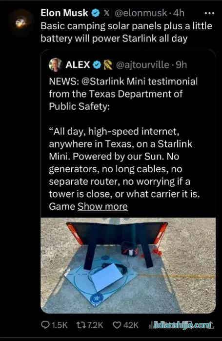 馬斯克寫道,露營用光伏發電板搭配光充戶外電源,可以為Starlink全天候供電。