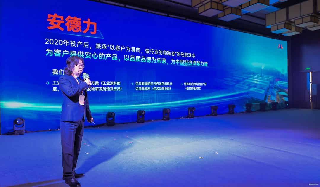 江西安德力高新科技有限公司副總經(jīng)理王立峰先生,介紹了安德力在環(huán)保油墨樹脂、水性工業(yè)涂料樹脂、碳硅改性材料的性能及應用,為多個行業(yè)提供了綠色、高效的應用解決方案。