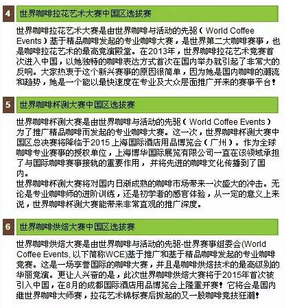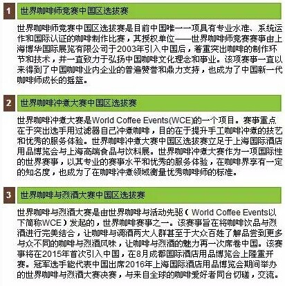 摘要: World Coffee Events(WCE)六大世界級賽事明年全面登陸中國,中國區賽事引進方上海博華國際展覽公司開通了報名通道,各位咖啡師或個人愛好者,請抓緊報名咯!