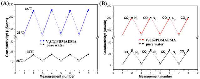 此外,V2C良好的導(dǎo)電性,使得V2C@PDMAEMA對(duì)CO2-溫度雙重響應(yīng)能夠在電導(dǎo)率更加容易地體現(xiàn)。在溫度由25℃和65℃之間轉(zhuǎn)變時(shí),V2C@PDMAEMA水溶液的電導(dǎo)率從125μS cm−1到225μS cm−1間發(fā)生可逆變化,這個(gè)變化幅度比純水要大得多(如圖3(a))。CO2和N2的交替鼓入也能使V2C@PDMAEMA水溶液的電導(dǎo)率發(fā)生可逆響應(yīng)。因此該實(shí)驗(yàn)表明通過(guò)對(duì)電導(dǎo)率的測(cè)定,V2C@PDMAEMA可以有助于監(jiān)測(cè)體系中溫度和CO2的濃度,視為一種良好的傳感器材料。