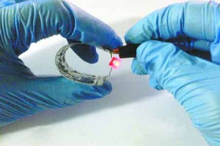 一個偌大的手機揣在兜里,鼓鼓的,在夏天總是感覺有些不方便,如果哪天手機可彎可卷,能像啪啪圈一樣戴在手臂上應(yīng)當是件很酷的事情吧。這樣的手機需要什么樣的電池呢?應(yīng)該是可彎可卷的柔性全固態(tài)薄膜鋰電池。現(xiàn)在實驗室已經(jīng)研制出了這樣的鋰電池。國外有報道稱已經(jīng)在80μm厚的柔性Al箔上沉積Al/Li8V2O5/LiPON/V2O5/Au,制備出了柔性薄膜鋰電池,該電池在10μA/cm2電流密度下循環(huán)次數(shù)超過5800次,容量衰減小于7%。自2003年起,國內(nèi)一些高校和科研院所陸續(xù)開展了柔性薄膜鋰電池的研究,但這些研究主要集中在關(guān)鍵材料制備上,缺乏電池整體制備技術(shù),仍處于基礎(chǔ)研究的初級階段,同時受資金和技術(shù)制約,柔性全固態(tài)薄膜鋰電池至今沒有產(chǎn)業(yè)化的報道。中航工業(yè)航材院也組建了相應(yīng)的團隊,現(xiàn)已在超薄聚酰亞胺(PI)上實現(xiàn)了以LiPON為電解質(zhì)的單芯柔性薄膜鋰電池和串并聯(lián)電池模塊也在金屬箔基片上實現(xiàn)了更適用于商業(yè)化的薄膜鋰電池,實驗數(shù)據(jù)目前在持續(xù)測試中,圖為中航工業(yè)航材院制備的柔性薄膜鋰電池的原理型樣件。