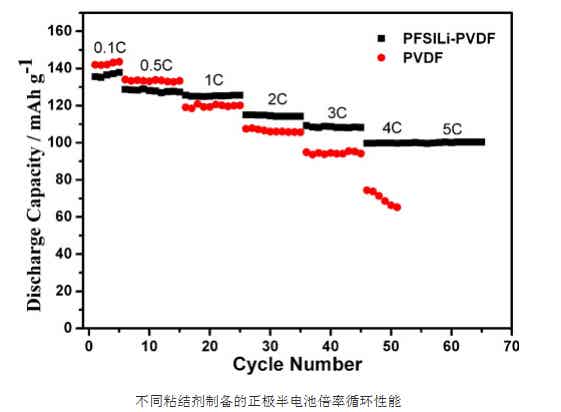 將含有離子粘結劑的磷酸鐵鋰(LiFePO4)正極極片與鋰片裝配成電池評價其電池循環性能,發現其充放電穩定。且當充放電倍率增加到4C,含有PVDF粘結劑的LiFePO4極片的放電容量僅有74mAh/g,且呈現大幅下降趨勢。而含有導電粘結劑的極片在4C或5C可以維持放電容量在100mAh/g。表明導電粘結劑有利于提高大電流充放電下的放電容量和穩定性,比普通非離子型粘結劑更加適用于動力鋰電池。該部分工作發表在J. Mater. Chem. A, 2013,1,15016以及J. Power Sources, 2014,256,28上。目前,該團隊正在開展該類粘接劑的中試放大生產和產業化應用。