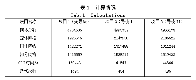 因結(jié)構(gòu)相對復(fù)雜,取消“自動設(shè)置”選項,將“細小固體特征細化級別”設(shè)為3級,“細化流體網(wǎng)格”設(shè)為2級,啟用狹長通道細化,其中網(wǎng)格數(shù)目為6,細化級別為4級。因結(jié)構(gòu)相同,在相同的設(shè)置下,3個項目劃分的網(wǎng)格數(shù)相近,網(wǎng)格總數(shù)為接近500萬個結(jié)構(gòu)化網(wǎng)格,詳見表2。本分析采用8核處理器+16G內(nèi)存專業(yè)析工作站計算。從CPU計算時間和迭代次數(shù)可觀察:雖然項目1的網(wǎng)格數(shù)量最少,但項目1的計算時間和迭代次數(shù)遠遠大于項目2和項目3,由此,可推測軟件在計算項目2和項目3比較流暢。