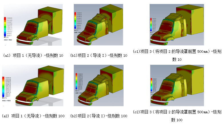 針對一汽柳特的一款長頭型重卡車的三種車頭進行CFD流體分析,結(jié)果如下: