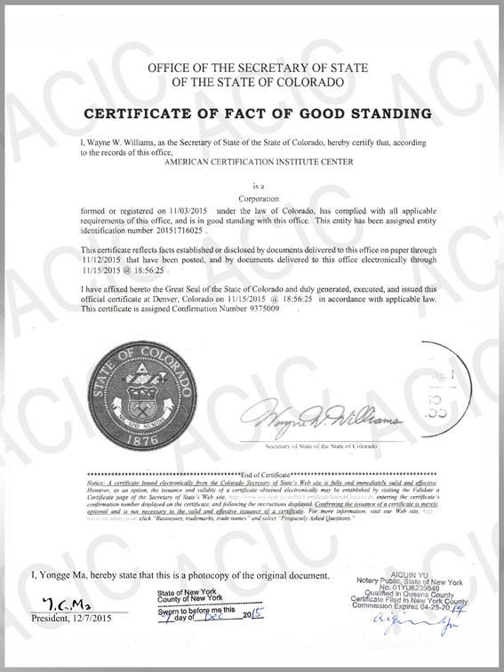 美國科羅拉多州政府頒發的注冊證書(經美國公證處及紐約州務卿公證)